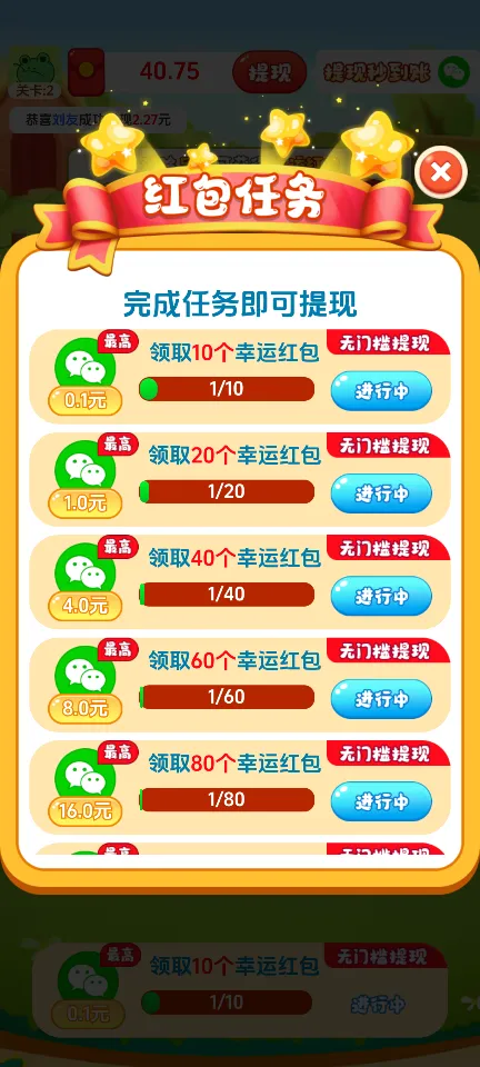 3、额外激励系统:通过设定领取红包数量的额外奖励,增加了游戏的目标感和长期吸引力,鼓励玩家深入游戏,获得更多惊喜。