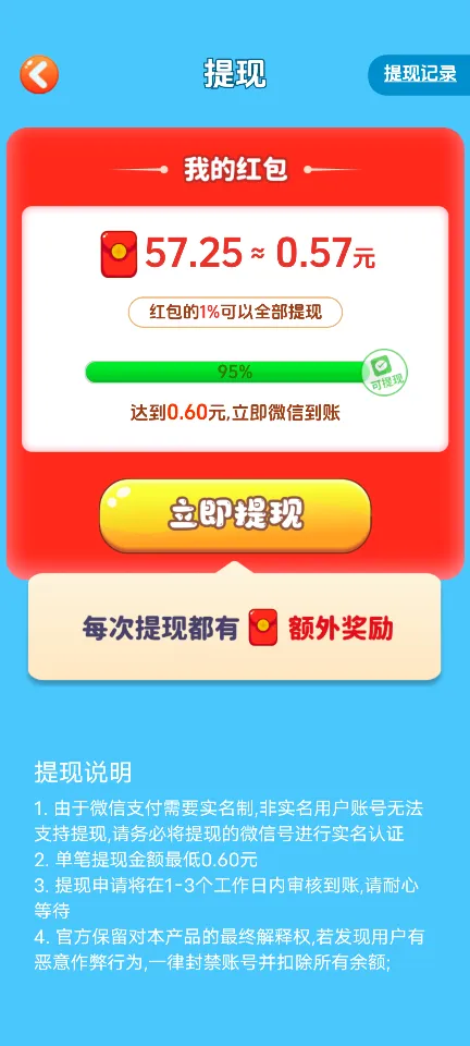 4、红包币兑换现金:100红包币即可兑换1元人民币,兑换门槛低,收益直观,让玩家的努力迅速变现。