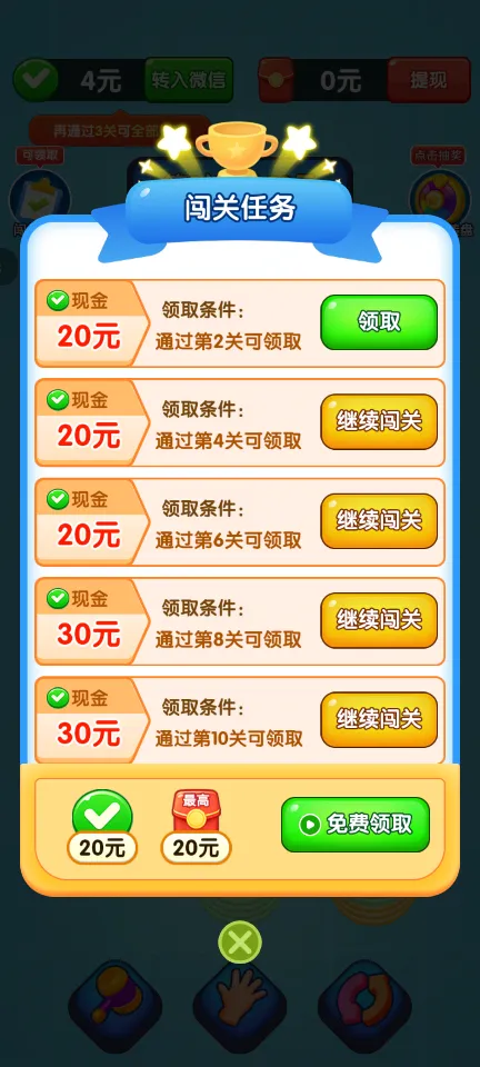 3、奖励系统:成功过关后,玩家可以直接获得微信零钱和红包奖励。游戏内置的奖励机制鼓励玩家不断挑战,通过观看视频广告还能额外获得大量奖励,增加游戏的趣味性和吸引力。