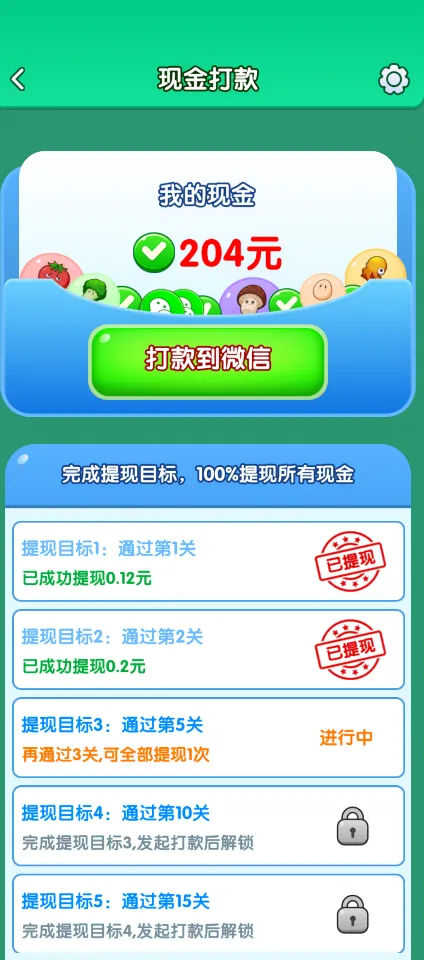 2、提现金比例升级:随着玩家通过的关卡数增加,红包提现的比例逐步提高,最高可达100关100%提现,激励玩家持续探索更多关卡。