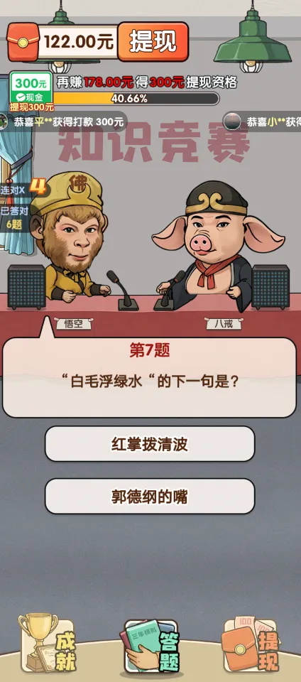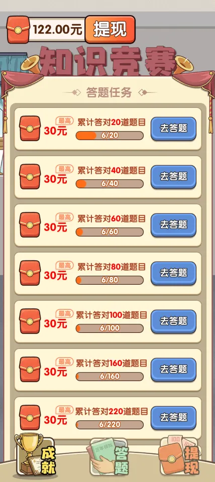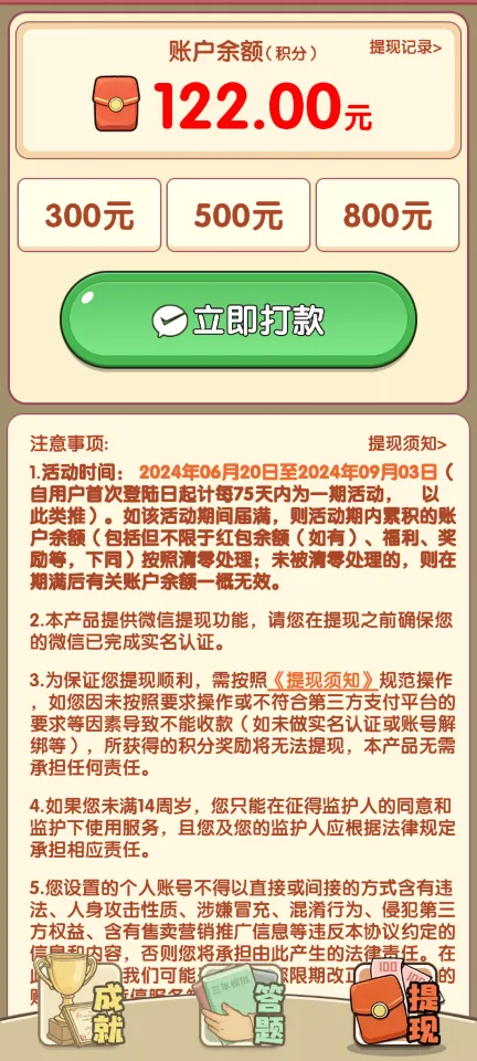 2、提现系统:玩家在游戏中赢得的红包可累积,一旦达到300元,即可申请提现至指定账户,实现知识变现。