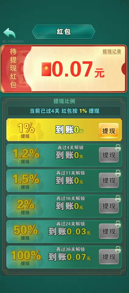 3、高回馈激励:通过设置逐步提升的红包提现比例,鼓励玩家持续挑战,享受游戏的同时,还能获得实质性的奖励,增强了游戏的黏性和吸引力。