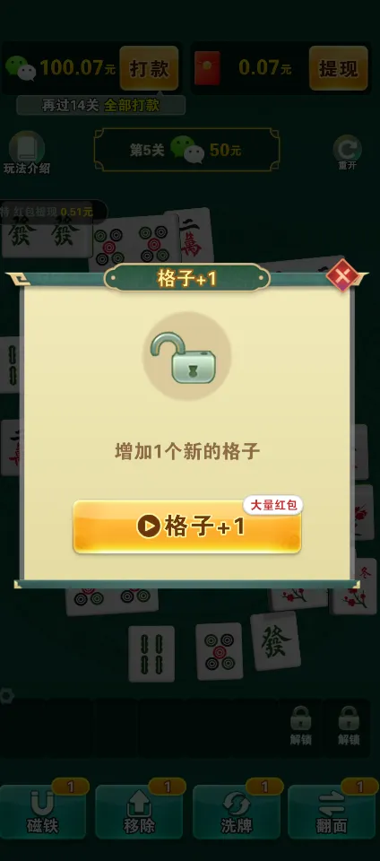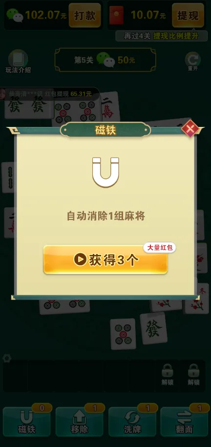 1、视频助力:观看视频广告不仅可以获得额外的大量红包,还能解锁特殊格子放置更多麻将或使用强力道具,使消除过程更加顺畅。