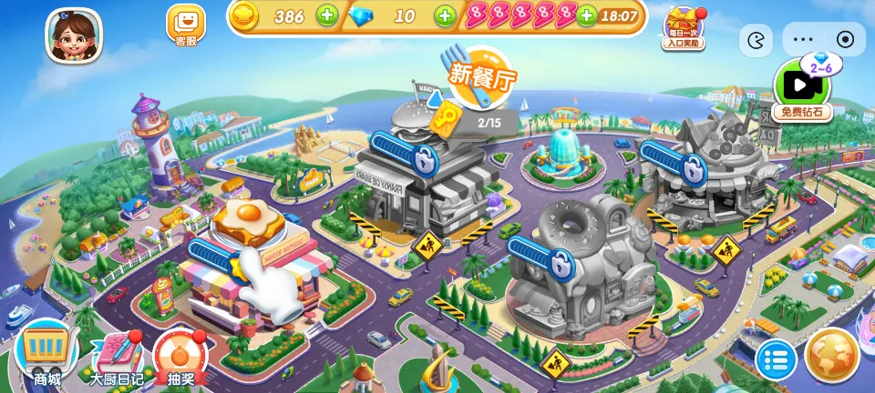 4、全球旅行:通过收集指定数量的钥匙,解锁新的美食店,每家新店代表一个不同的城市和美食文化,从巴黎的面包房到东京的寿司吧,不断扩展你的美食版图。