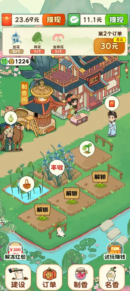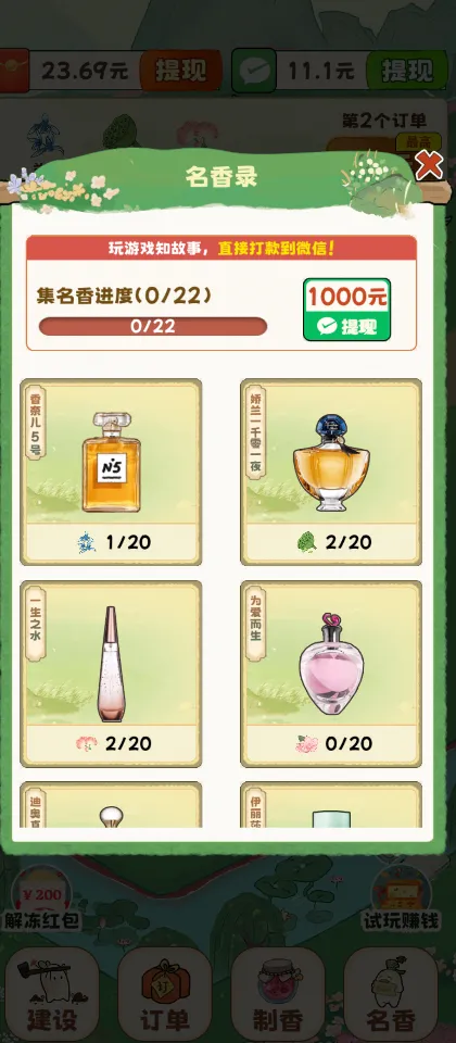 4、订单系统与红包奖励:游戏中设有订单系统,玩家需根据市场需求,完成订单即可获得红包奖励。特别是收集并制作出游戏设定的所有名香,更有丰厚的红包大奖等待着你。