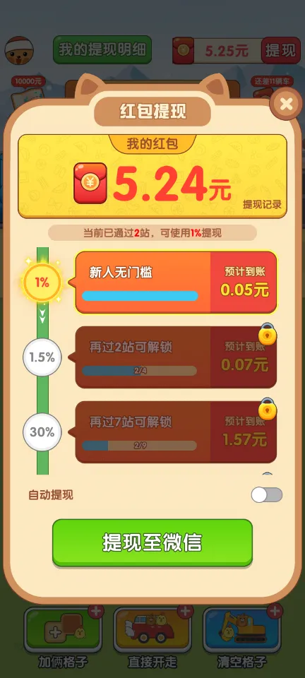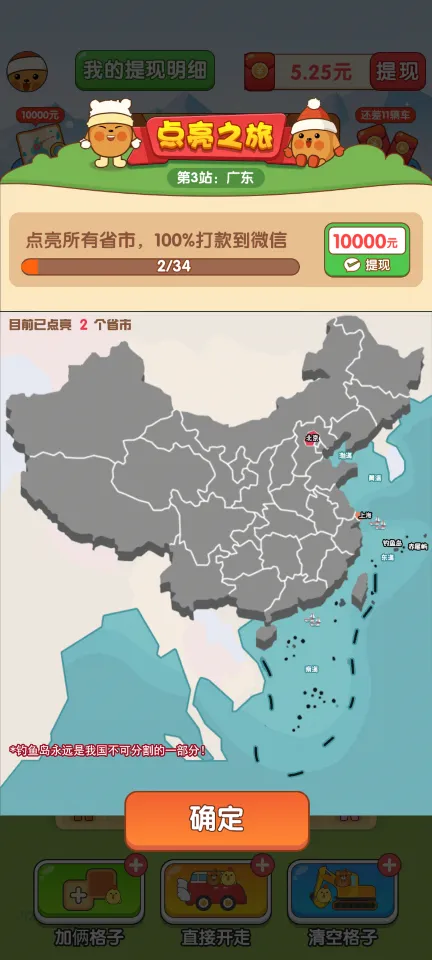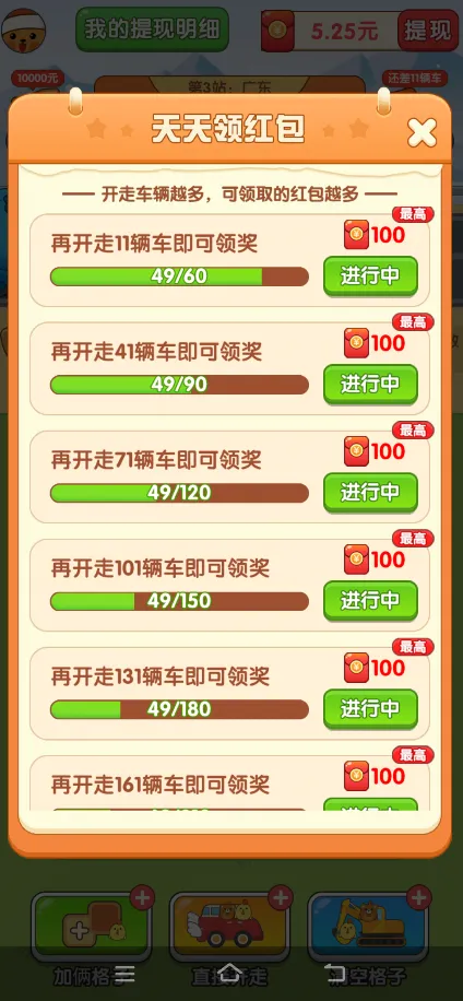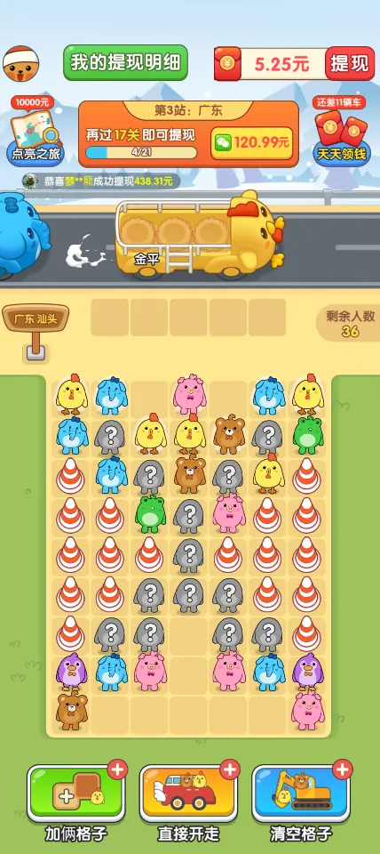 3、城市探索与奖励机制:随着游戏的推进,小动物们乘坐的汽车会前往不同的城市,点亮地图上的各个省份。完成这一系列旅程后,玩家将有机会获得丰厚的红包奖励,奖励的比例随着通过的站点数量而增加,达到34站,获得100%的红包奖励。