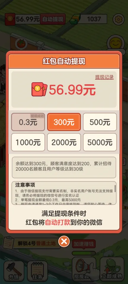 4、游戏币与红包奖励:出售蔬菜不仅能获得游戏币,达到一定条件还可以获得红包奖励,最低提现金额为0.3元。