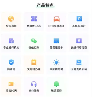 4、以及可以查看到ETC的产品特点,例如全国通用、不停车通行、太阳能充电、先通行后付款等特点。