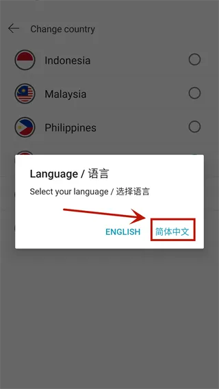 3、点击国旗图标将地区设置为新加坡,点击Continue后,在弹出的对话框内选择简体中文即可设置成功。