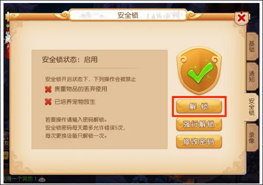 点击主界面“系统"按钮→右侧选择“安全锁"标签页→点击“解锁"进行操作