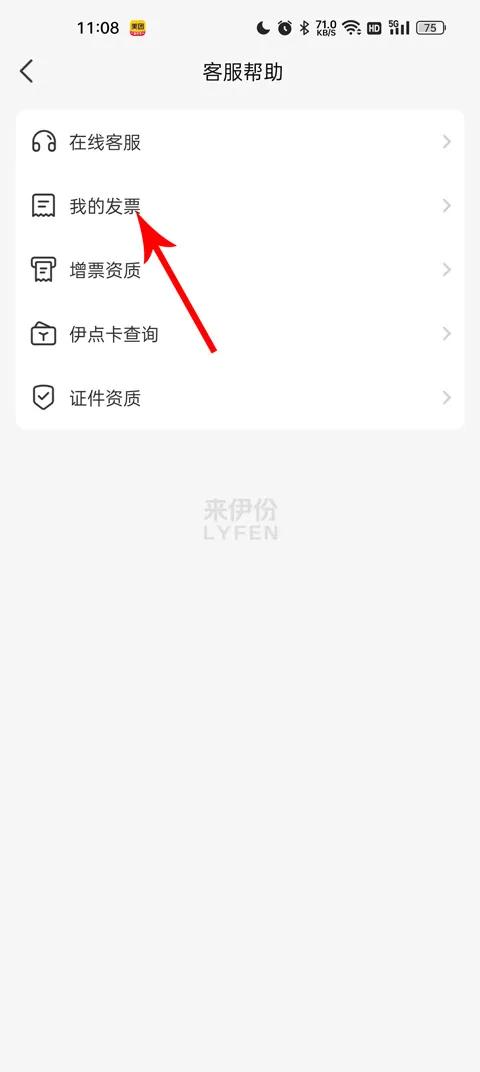 3、进入到客服帮助板块之后,在第二行找到我的发票,就可以查看自己购买的小票信息了。