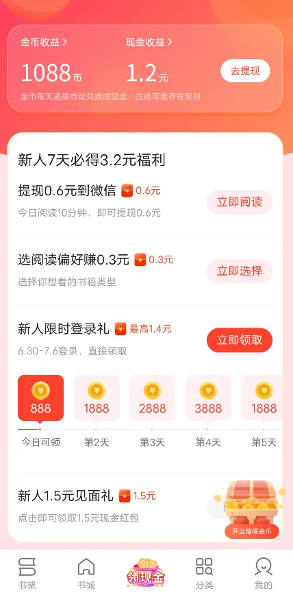 阅读/听书收益:通过阅读或收听小说,用户同样能累积金币,金币可在次日凌晨自动兑换为现金。