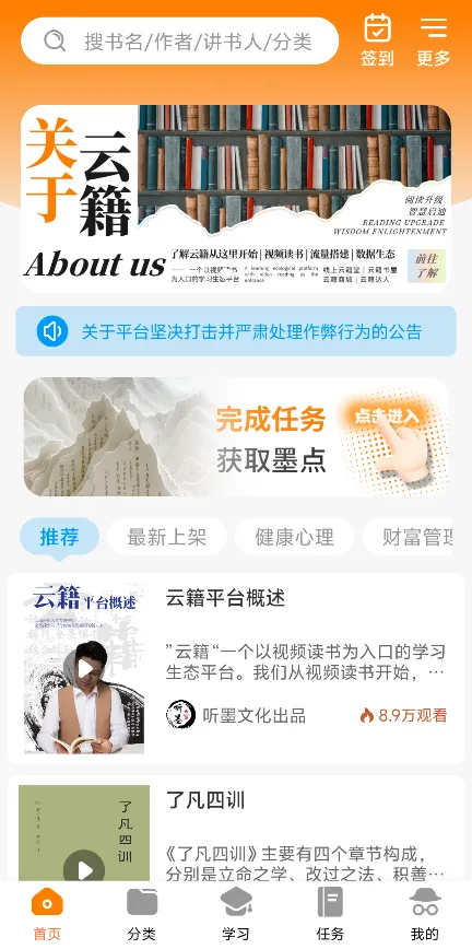 “云籍”致力于为用户提供丰富的阅读资源与便捷的学习体验。平台不仅提供了大量的书籍资源,还通过短视频的形式让学习变得更加生动有趣。更重要的是,云籍通过独特的“墨点”积分系统,让用户在享受知识的同时还能参与平台收益的分配。