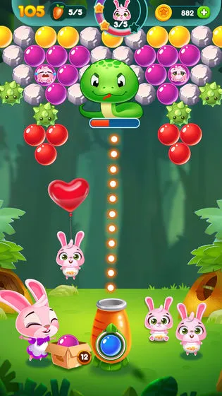 必须不断解锁有趣的内容,并且通过帮助兔子消除所有的泡泡,你还可以获得强大的物品。