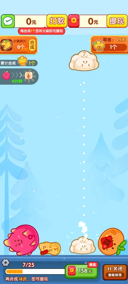 水果合成:当两个相同类型的水果碰撞时,它们会自动合并为一个更高级别的水果,继续这一过程以创造最高级的水果。