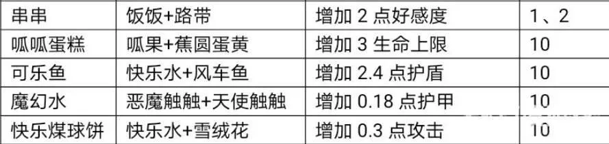 5、快乐煤球饼,配方:快乐水 雪绒花、效果:攻击 0.3、饱食度 10