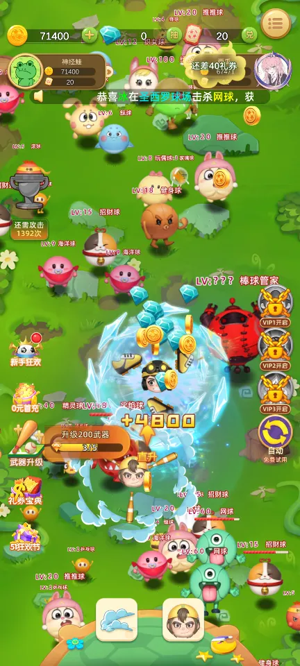 "疯狂的球球红包版" 是一款集休闲与收集乐趣于一身的割草风格手机游戏,专为喜爱轻松游戏体验并渴望在娱乐中赚取小奖励的玩家设计。游戏采用自动战斗机制,让玩家置身于多彩的虚拟球场,通过挂机即可享受击败怪物、收集金币的乐趣。