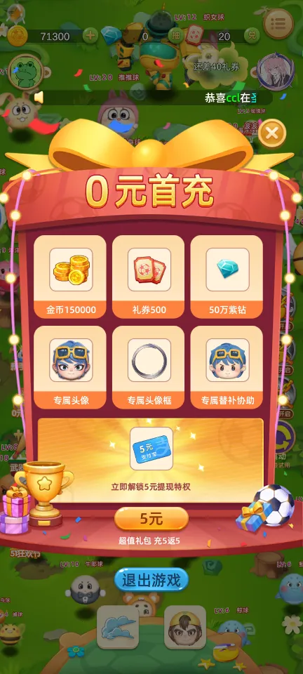 3、首充福利:首次充值的玩家可享受超值礼包,实现零元购,并享受充五返五的特别优惠。