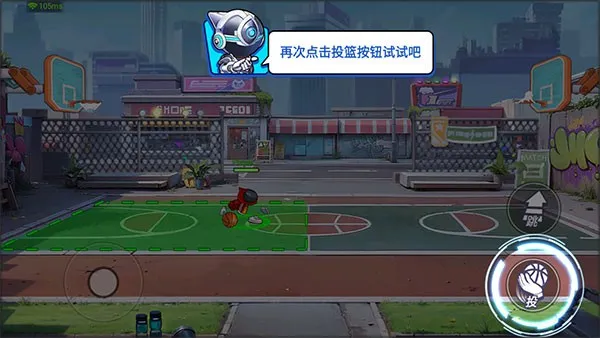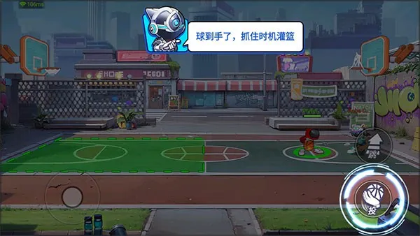 1、下载安装好游戏,进入新手教学,首先通过左边的轮盘控制角色移动,靠近篮球即可捡起。