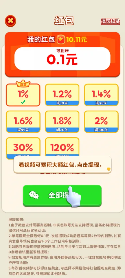 4、关卡解锁:随着关卡的递增,不仅能解锁更高的红包提现比例,还有机会赢取更多的现金奖励。
