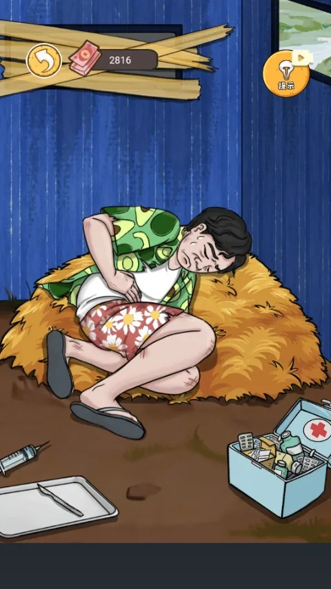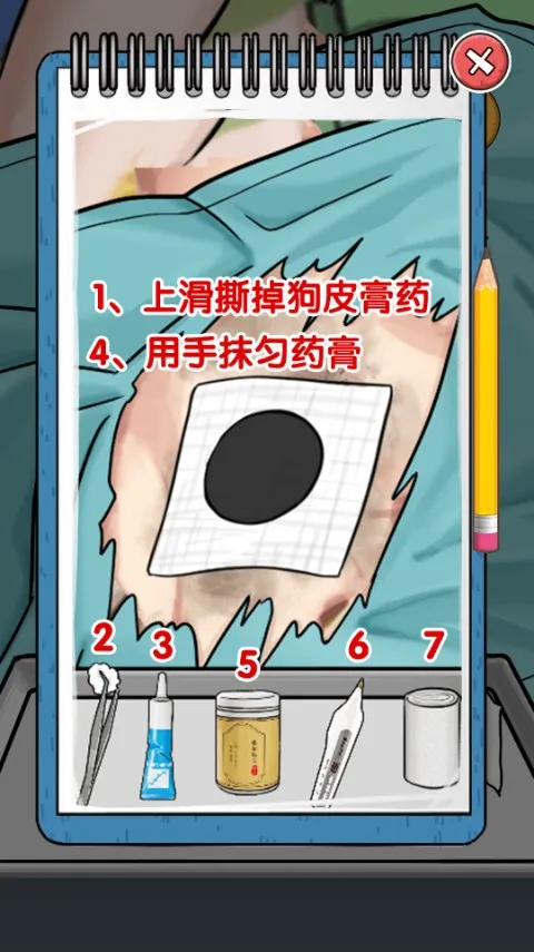 5、上滑撕掉他伤口上的皮膏药,拿起镊子棉球擦拭伤口,涂上药膏,用手摸匀,撒上万能药,缝上伤口,使用绷带包扎伤口。