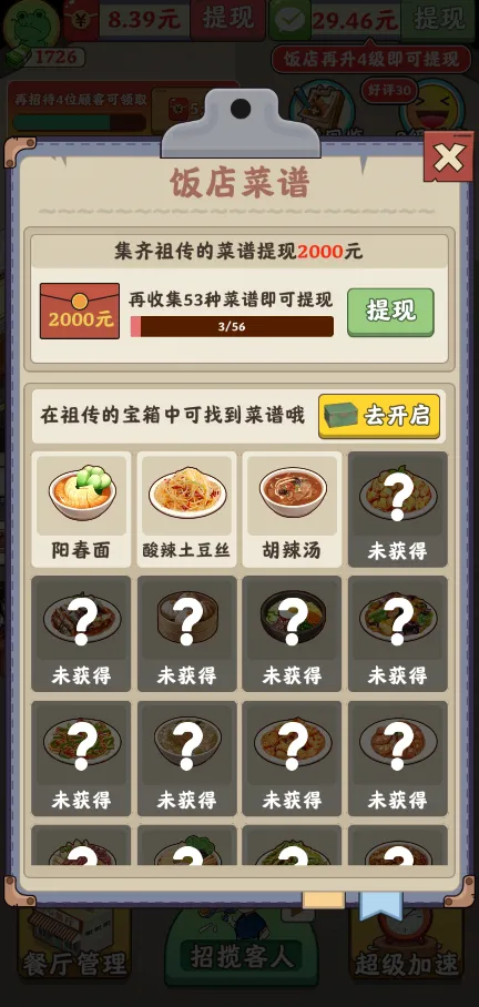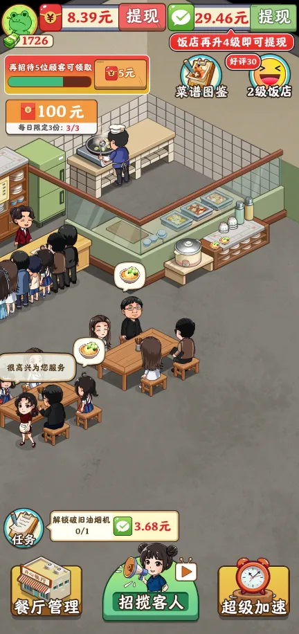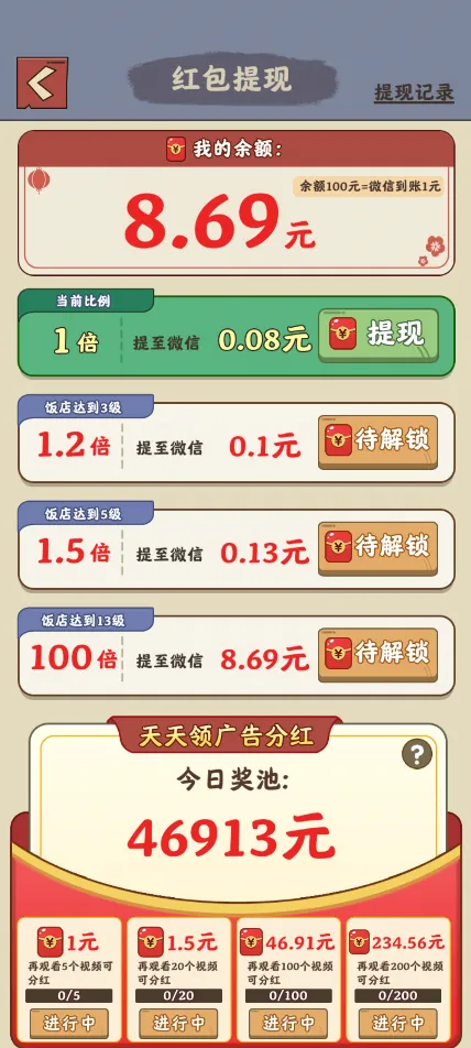 3、红包奖励倍增:随着饭店等级的提升,特别是达到13级时,玩家将解锁100倍的红包奖励,极大地增加游戏的收益乐趣。