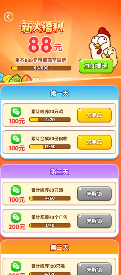 2、解锁高级鸡种:随着喂养进度的推进,玩家将逐步解锁更加稀有和高级的鸡种。这些高级鸡不仅外观独特,而且能带来更多红包奖励。