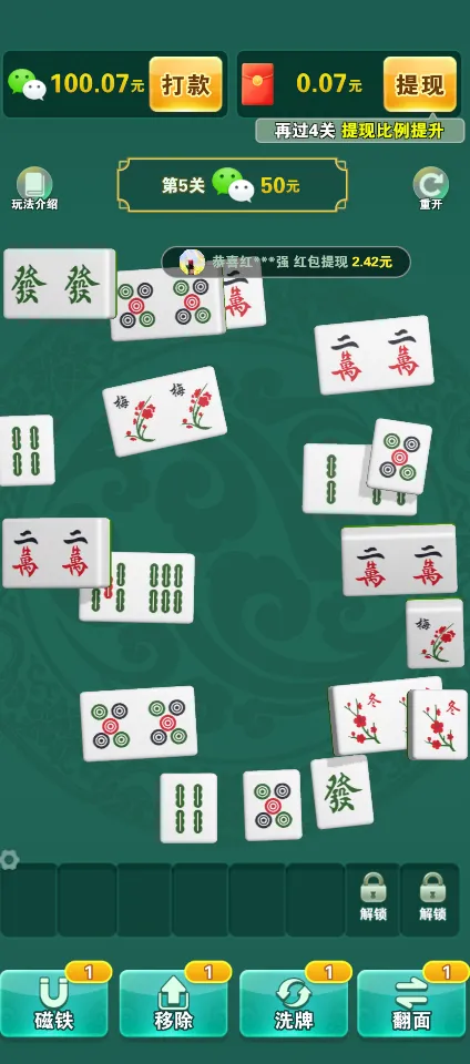 1、视频助力:观看视频广告不仅可以获得额外的大量红包,还能解锁特殊格子放置更多麻将或使用强力道具,使消除过程更加顺畅。