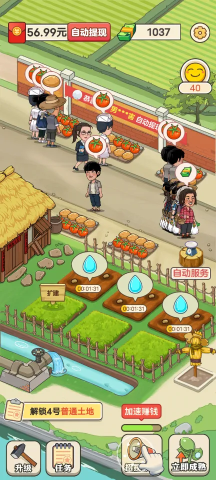 4、游戏币与红包奖励:出售蔬菜不仅能获得游戏币,达到一定条件还可以获得红包奖励,最低提现金额为0.3元。