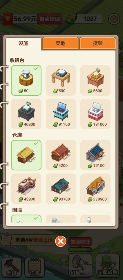 3、设施升级:使用游戏币升级菜地、货架等设施,提高生产效率和服务质量,增加顾客满意度。