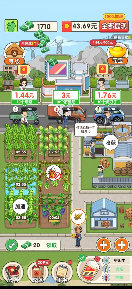 1、视频加速&奖励:观看视频广告可以加速植物生长过程,甚至直接完成酿酒环节,大大节省了等待时间。同时,视频观看还能增加出售酒品时的奖励,为玩家带来更多收入。