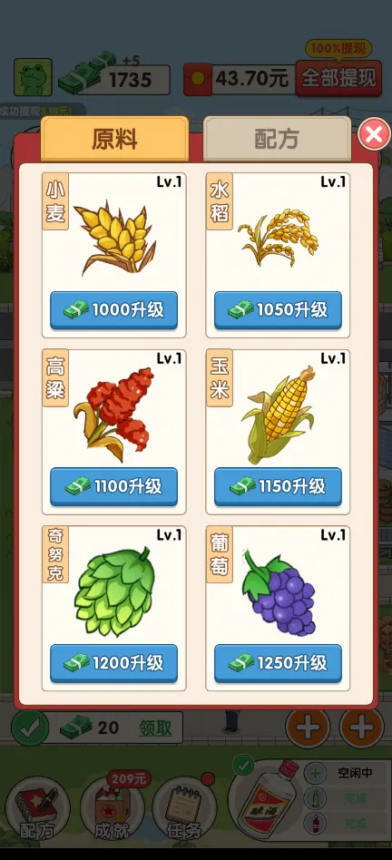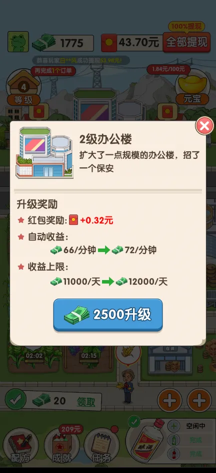 2、升级与扩展:使用游戏币可以升级植物种子和酿酒配方,提升产出质量和数量;投资于办公楼升级,能够增加游戏币的每分钟自动收益,同时招聘更多工作人员,提高生产效率。