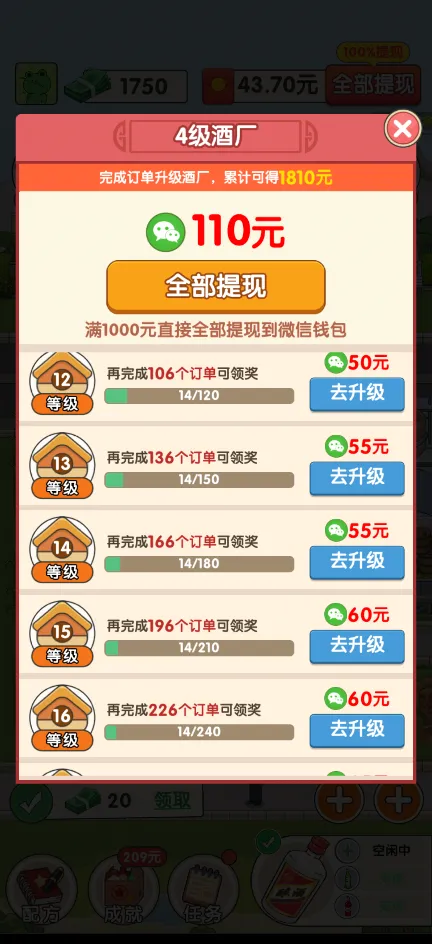 3、订单系统:完成特定数量的订单任务,可以提升酒厂等级,等级越高,红包提现比例越高,达到30级时,提现比例可达100%。