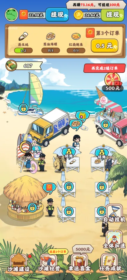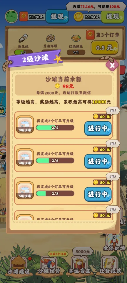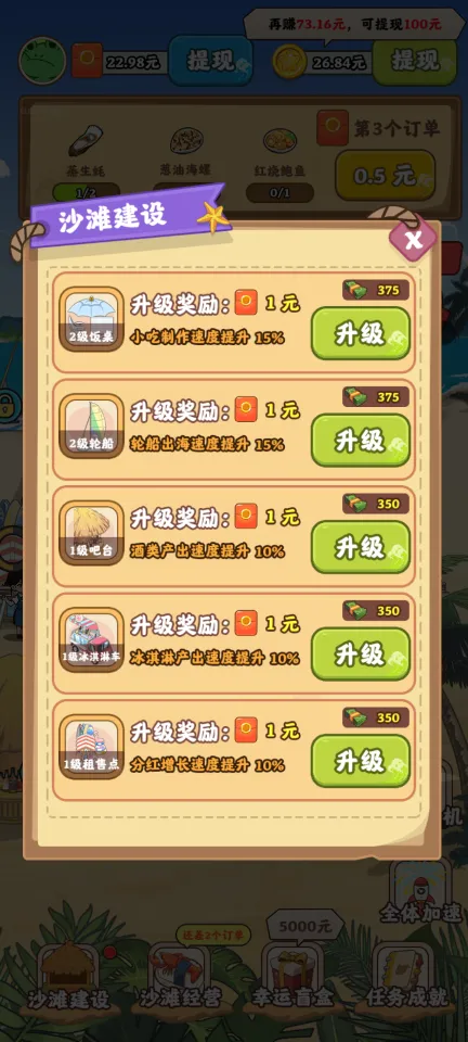 2、沙滩升级与建设:通过投资升级沙滩设施,不仅可以加快各种产出速度,还能美化沙滩环境,吸引更多游客,同时,升级过程中还有机会获得红包奖励。