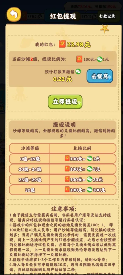 红包兑换机制:游戏中的红包可以累积到一定数量后兑换成现金,初始兑换比例为100红包兑换1元,随着沙滩等级的提升,兑换比例会变得更为优惠,最高可达100比100,即100红包直接兑换100元。
