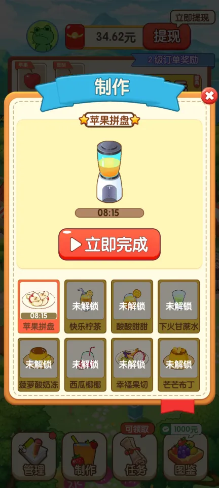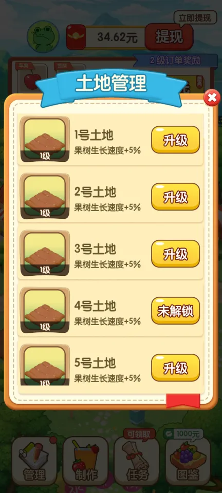 3、视频解锁:观看内置的视频广告,可以解锁新的土地、水果种类和果汁配方,加速果园的发展。