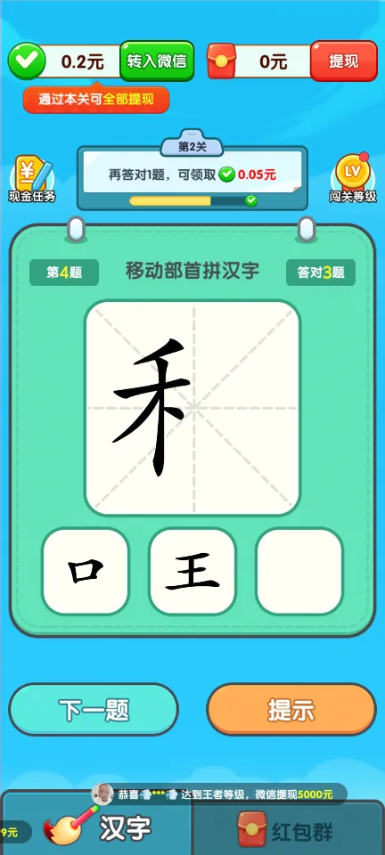 《汉字大赢家》是一款以汉字为主题的益智闯关游戏,它巧妙地结合了汉字学习与娱乐挑战。在游戏中,玩家需要通过给现有汉字加一笔或移动部首来创造新的汉字,这不仅考验了玩家对汉字结构的理解,还提升了他们的创造力和逻辑思维能力。