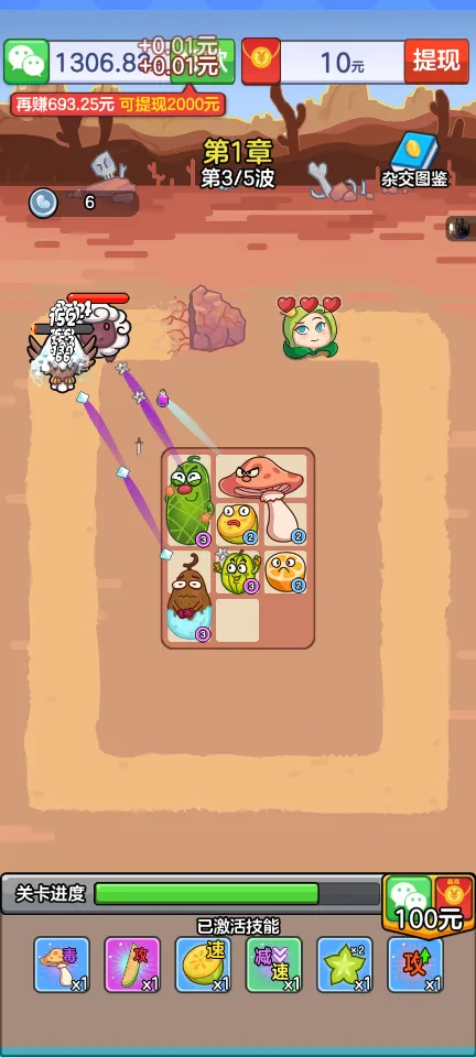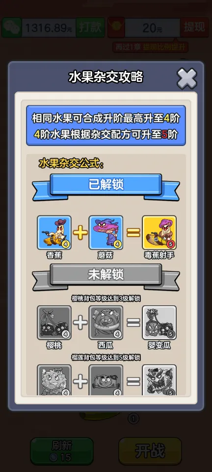 水果合成:玩家可以通过将两个相同等级的水果合并来获得更高等级的水果,从而大幅提升战斗力。