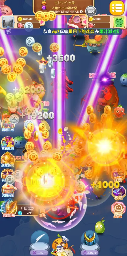 经典切水果:玩家需要用手指在屏幕上滑动来切割从屏幕下方飞出的各种水果,同时避免碰到炸弹等障碍物。