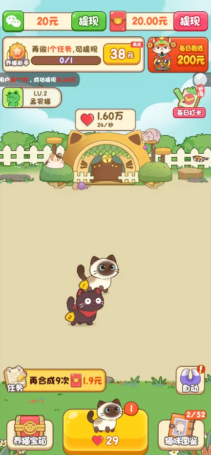 合成新猫:玩家可以通过将两只相同品种的猫咪合成为更高品质的新猫,创造出更加稀有的猫咪品种。