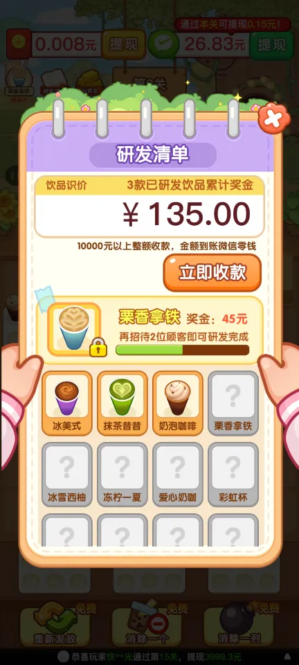 新品研发:利用游戏中的资源,玩家可以解锁新的奶茶配方,研发出更多独特口味的奶茶,吸引更多顾客光临。