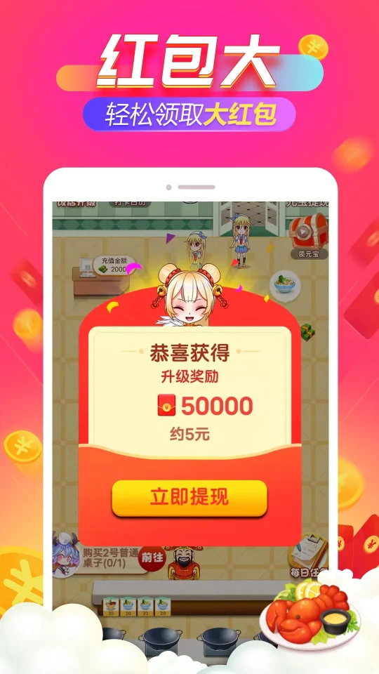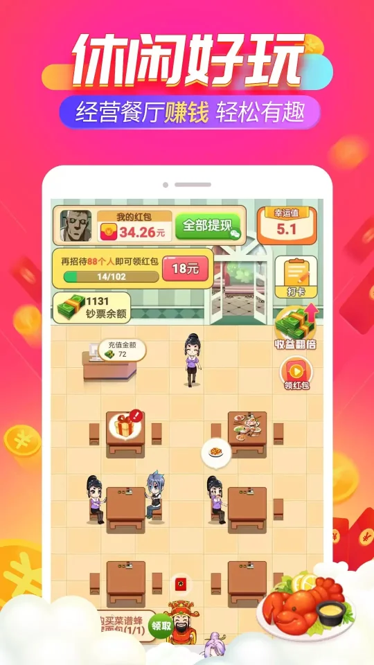 《开心饭店》是一款结合了模拟经营与红包奖励机制的休闲手游。玩家将扮演一名餐厅老板,通过精心管理和发展自己的餐厅,吸引更多顾客上门,从而赚取游戏内的金币和红包。这些红包可以直接提现至微信钱包,实现边玩游戏边赚钱的乐趣。