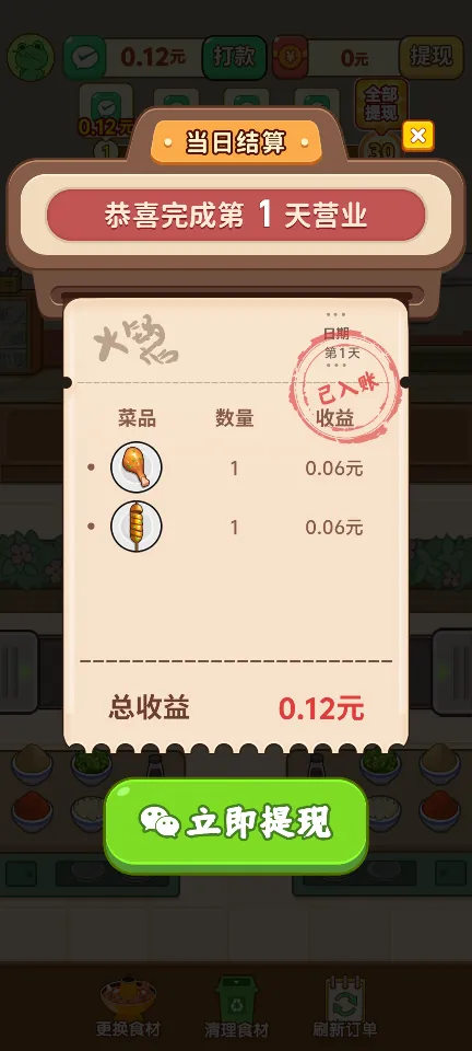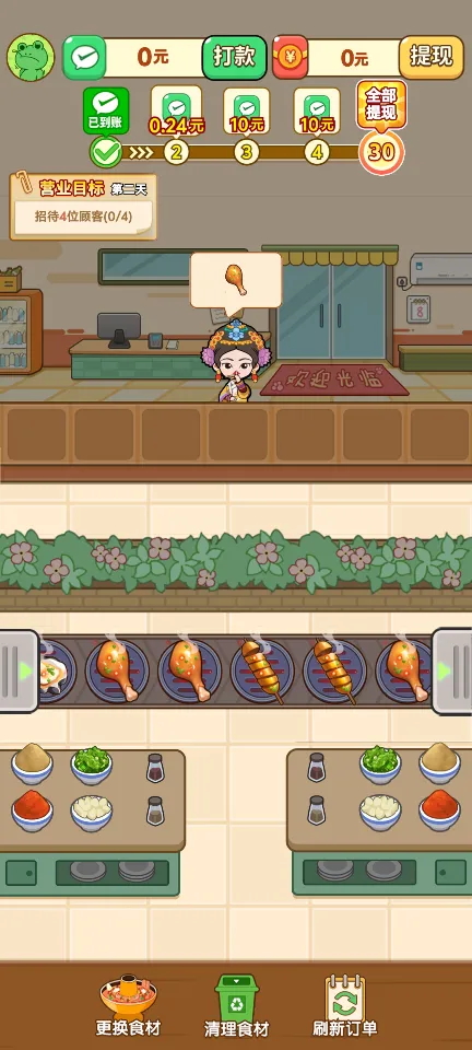 赚取绿钞:通过高效经营赚取游戏内的货币——绿钞,用于购买新设备、装修店铺或解锁新的菜式。