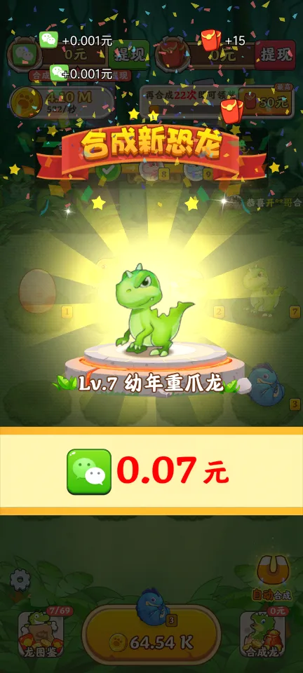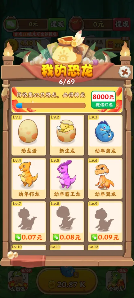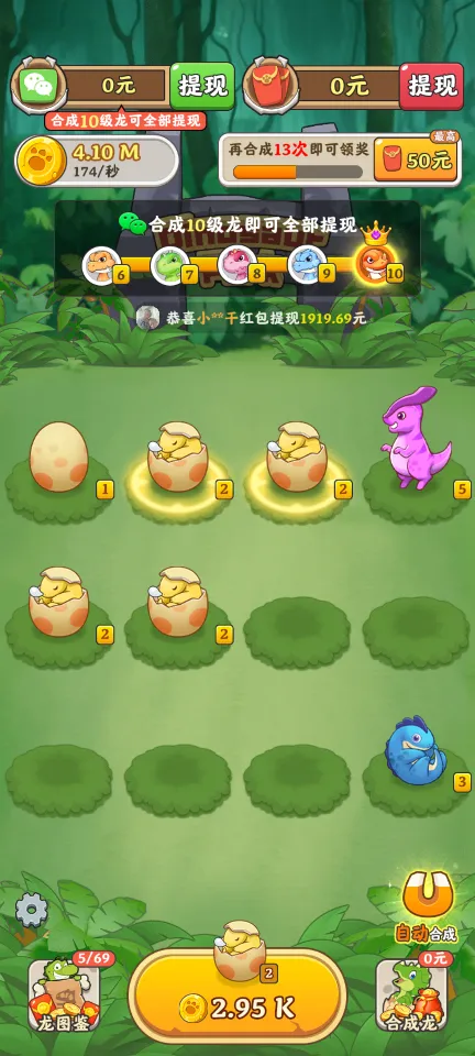 恐龙多多是一款充满创意与乐趣的合成类休闲游戏。玩家可以通过简单的拖拽操作将相同的小龙合并升级,随着等级提升,还能解锁形态各异的恐龙种类,并有机会收集象征福禄寿喜财的五福龙以获得丰厚奖励。