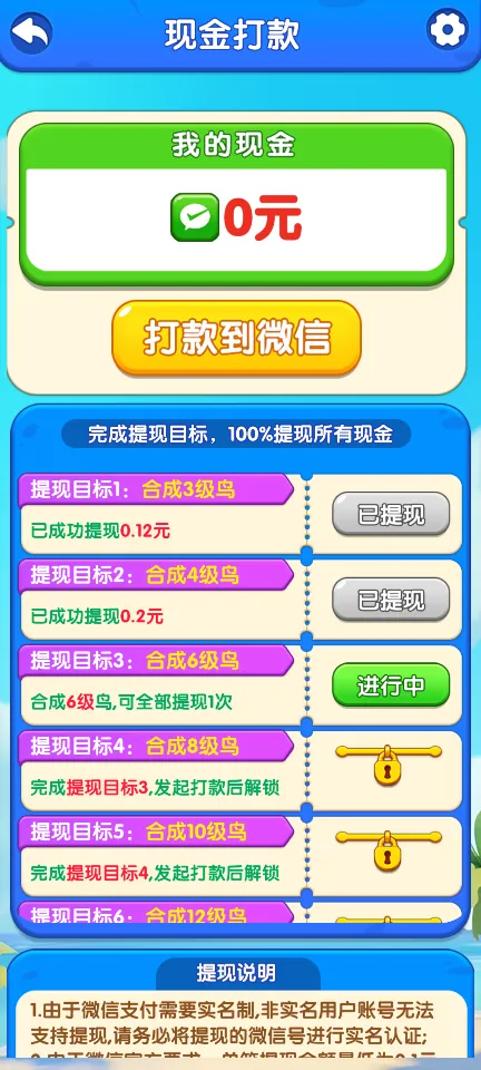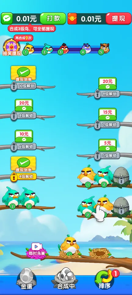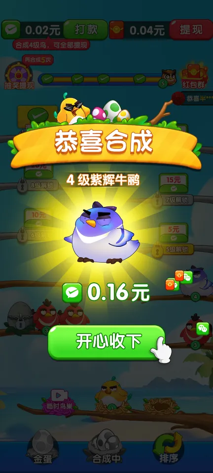 基础合成:游戏的基本规则非常简单——只需将三个相同类型的菜鸟拖放到一起即可完成一次合成。每次成功合成后,都会产生一个新的、等级更高的菜鸟。