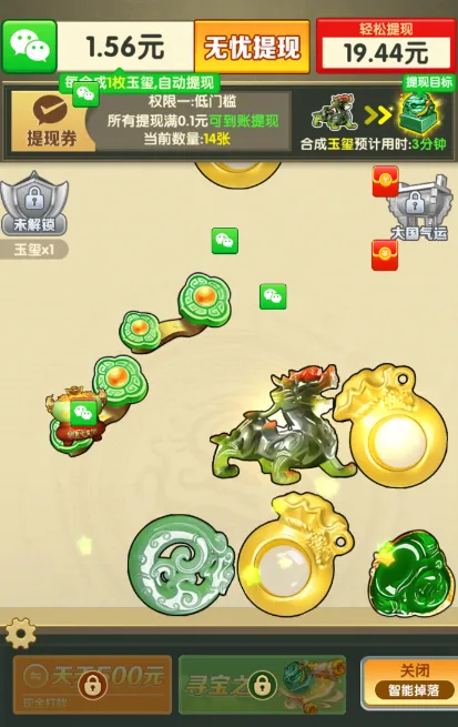《财气冲宵》是一款以翡翠古董为主题的创新掉落合成游戏。在这个游戏中,玩家将通过匹配和合成各种精美的翡翠古董来提升价值,并有机会兑换成实际的奖励。随着游戏进度的推进,不仅能够享受合成的乐趣,还能获得丰厚的回报,包括大额红包等福利,真正实现边玩边赚钱的美好愿望。