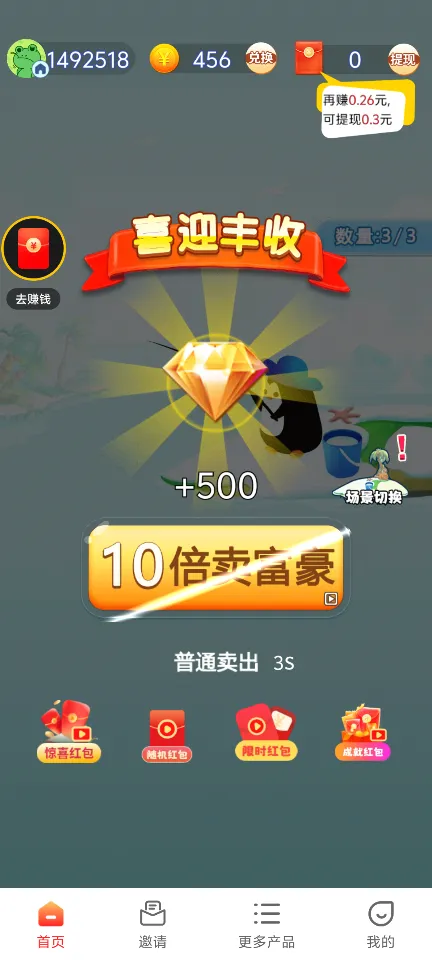 红包兑换机制:创新性的加入了金币兑换红包功能,增加了实际回报。