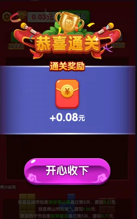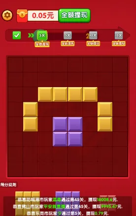 现金奖励:每次成功消除方块后,玩家可以获得一定数额的现金奖励,积累到一定程度即可提现至微信账户。