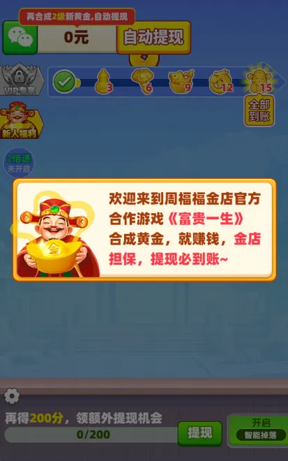 《富贵一生》是一款以黄金饰品为主题的下落合成游戏。玩家通过碰撞两个相同的黄金饰品来合成更高级别的饰品,随着级别的提升,玩家不仅能享受到合成的乐趣,还能获得相应的奖励。这款游戏以其简单易懂的玩法和丰富的奖励机制,吸引了众多寻求轻松娱乐与实际收益结合的玩家。