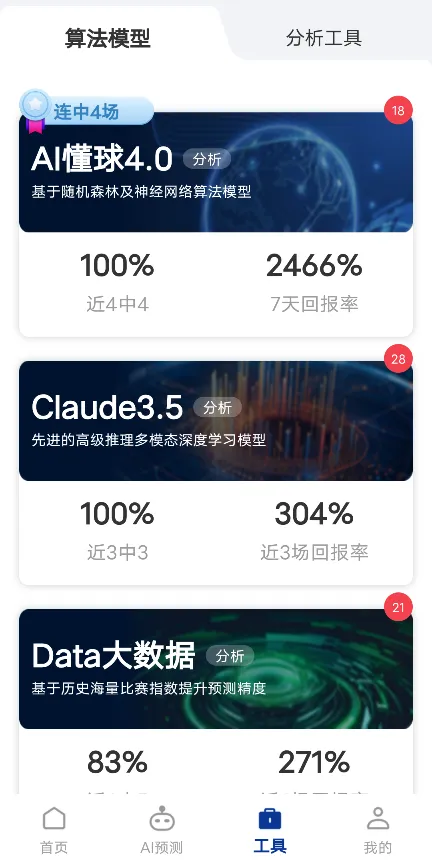 4、多种算法模型:AI懂球集成了四种算法模型,每种模型针对不同的数据特征和预测场景进行了优化,提供多样化的预测视角。